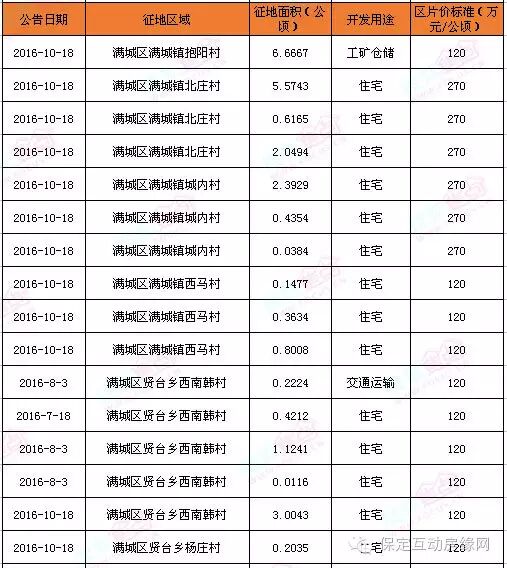 摘要:2016年11月7日,保定市国土资源局网站公布了14则征地告知书,征地区域均为满城区。本次征地面积共10.0015公顷,合150.0225亩。